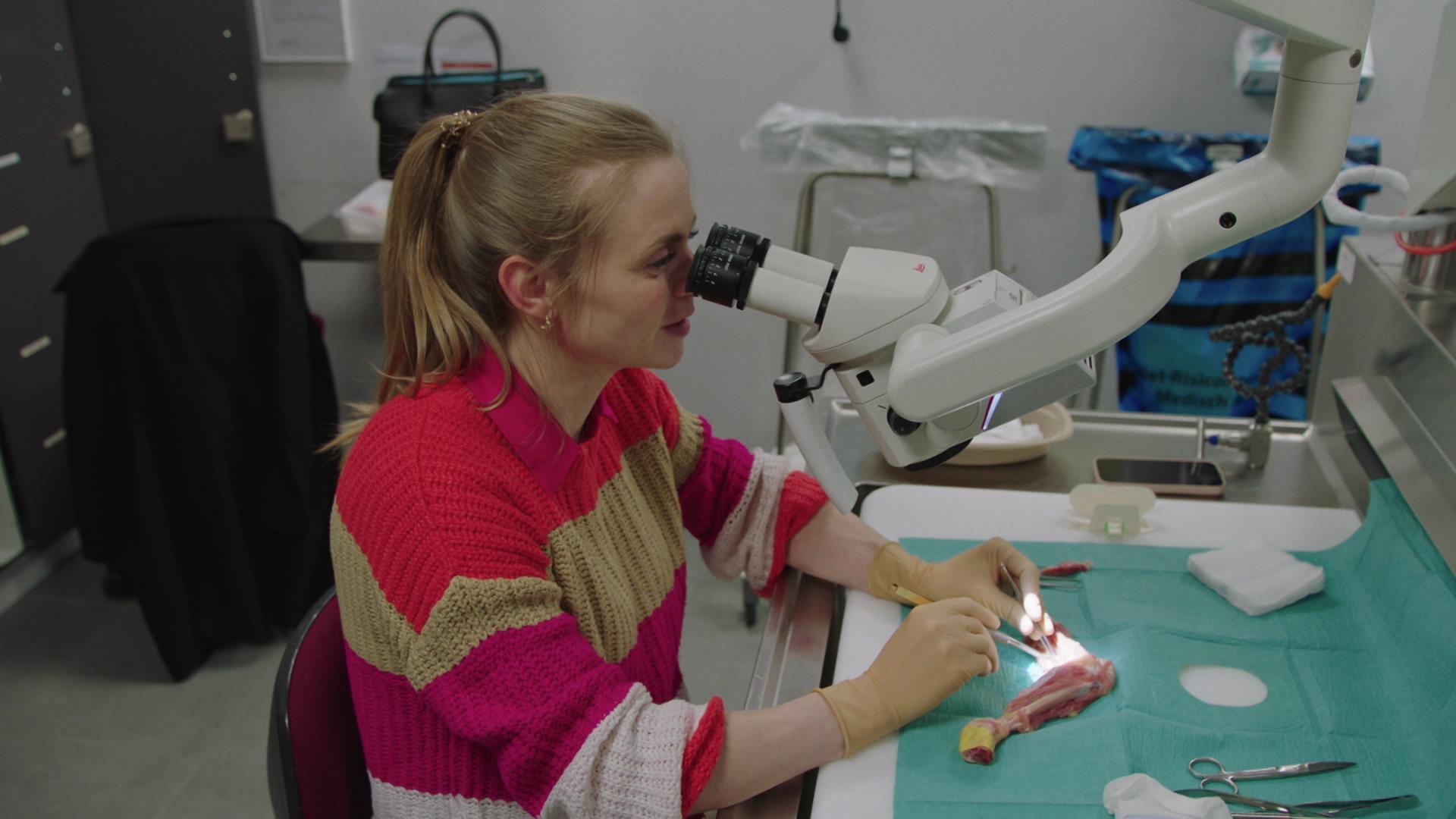 Geen proefkonijn voor plastisch chirurg in opleiding Alicja Zarowska, maar wel een proefkip. Na haar bevallingsverlof maakt ze zich klaar om opnieuw de operatiekamer in te gaan. Om haar technieken weer op punt te stellen, oefent ze in de praktijkruimte van haar vader, die neus-, keel- en oorarts is. Met scalpel in de hand begint ze te oefenen op een stukje kip: "Het knoopje leggen gaat al vlot, maar bij de steekjes zelf zie je dat het al even geleden is."