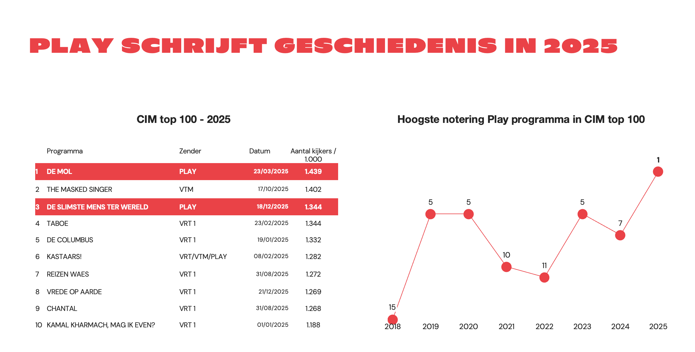 Play schrijft televisiegeschiedenis in 2025 met twee programma’s in de top 3 van de CIM top 100